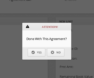 Here, you’ll have the option to select between YES and NO buttons. If you would like to add more merchandise to the agreement, select the NO button—you’ll be taken back to the list of inventory units on the agreement and can pick additional units for replacement.
