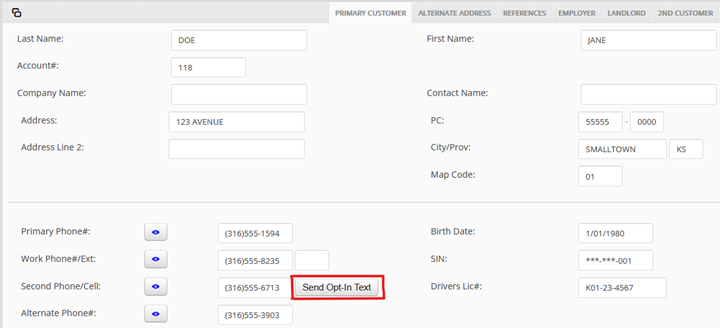 For self-service opt-in to work, the customer’s cell phone number must be correctly saved in the Secondary Phone#/Cell# field.